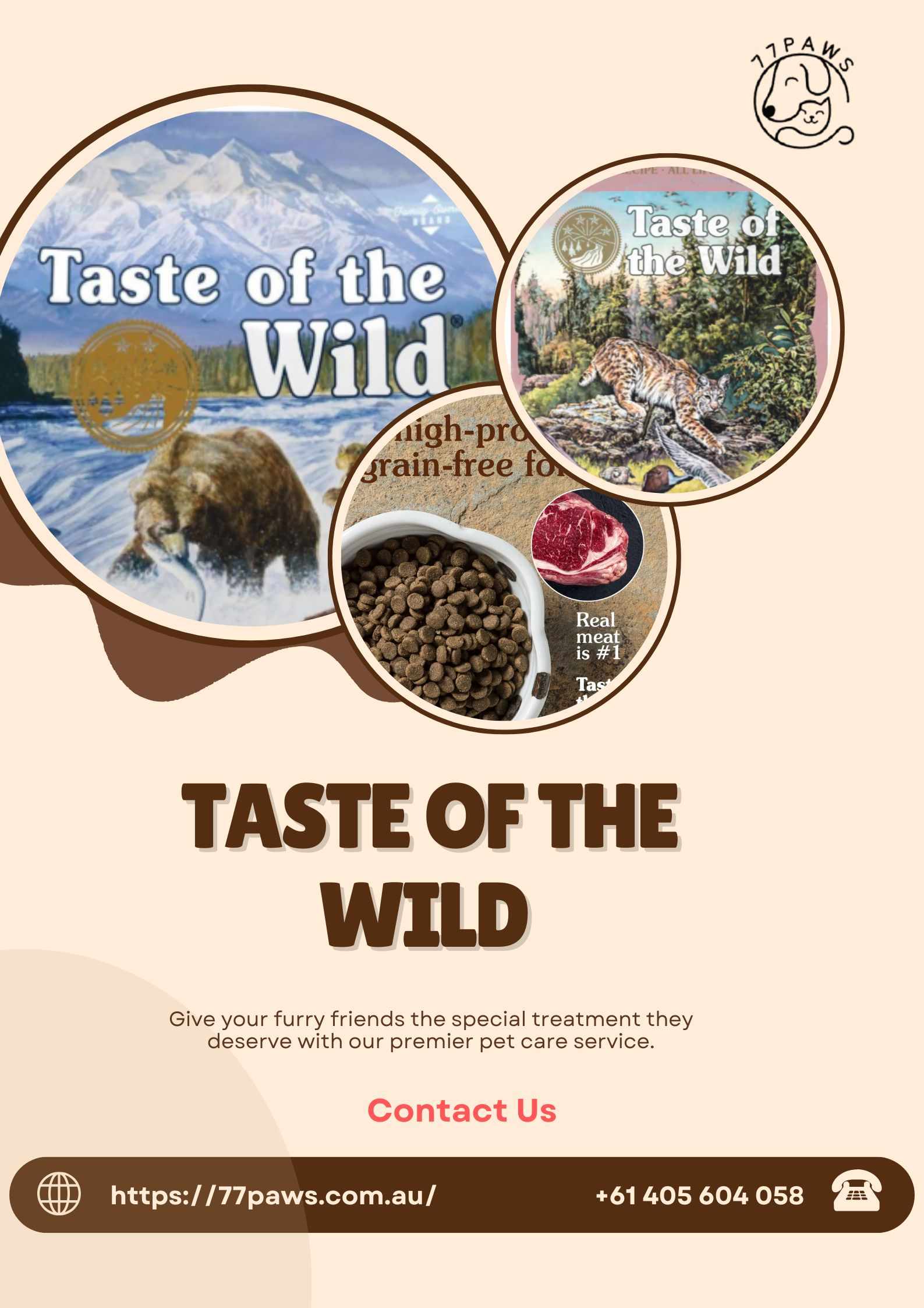 Discover Taste of the Wild dog food at 77Paws, formulated with premium proteins and natural ingredients to keep your dog strong, healthy, and happy. Perfect for active dogs who crave a wild, natural diet. Contact us +61 405 604 058