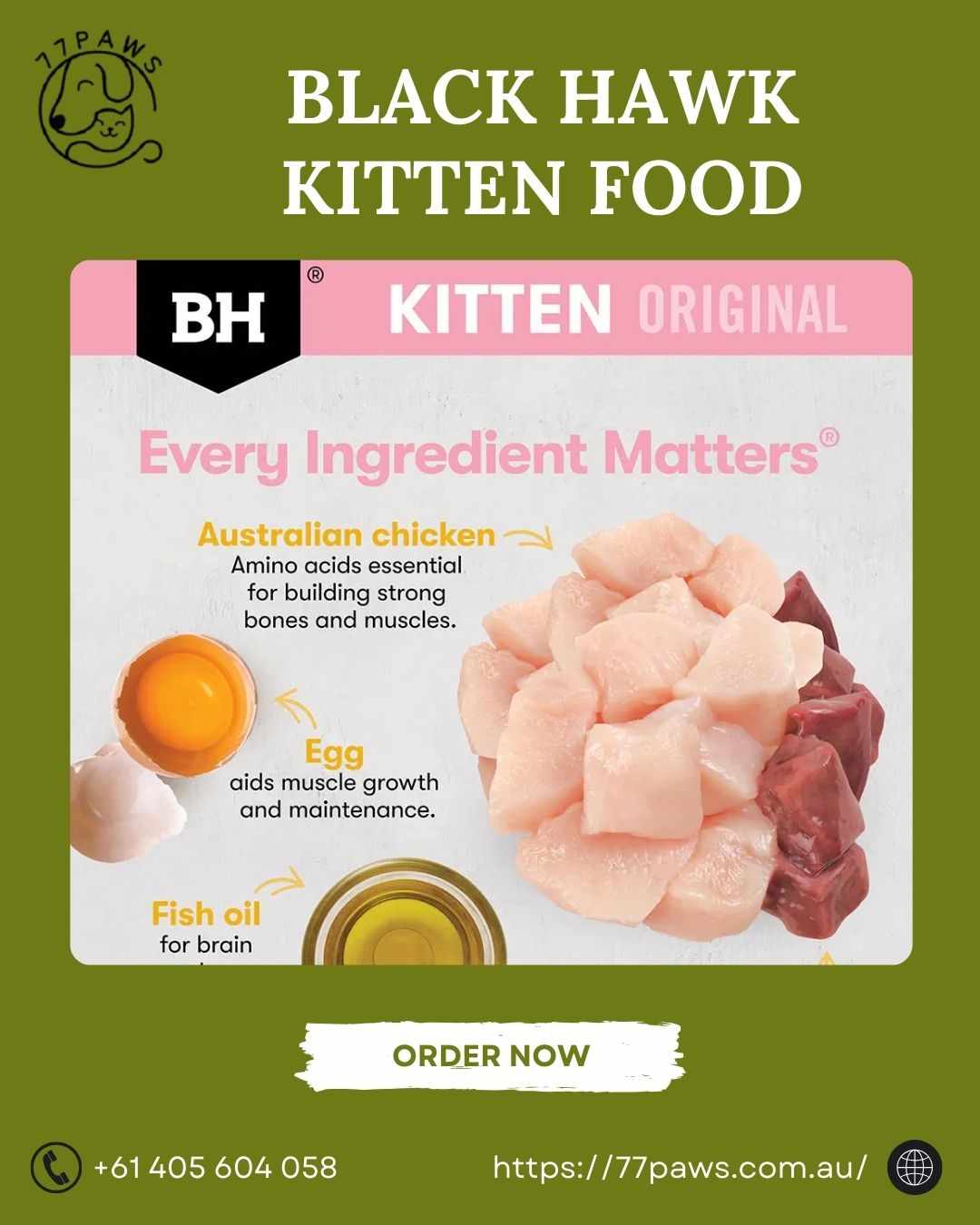Nourish your little feline with Black Hawk Kitten Food from 77Paws. With premium ingredients, vitamins, and minerals, it helps maintain optimal growth, strong bones, and a shiny coat. Delicious and balanced, this food keeps kittens energetic, healthy, and ready for every playful adventure. Contact us +61 405 604 058